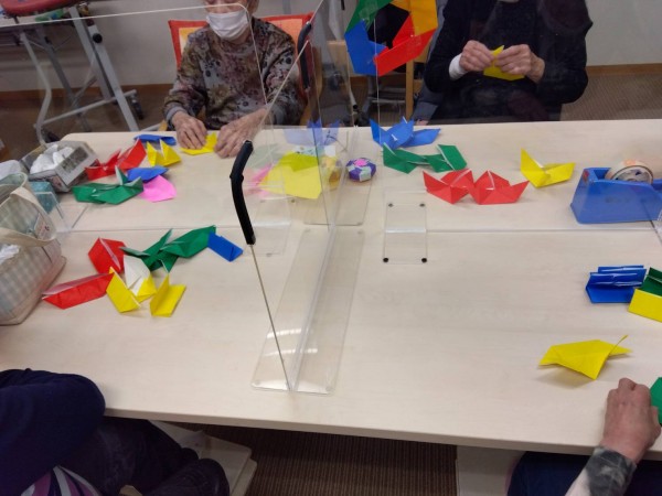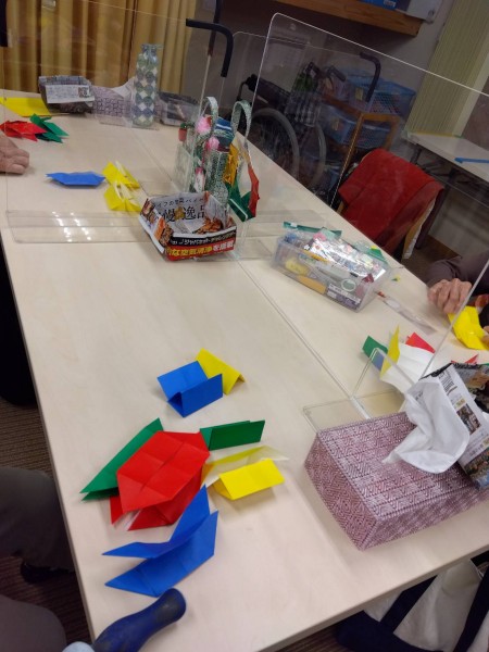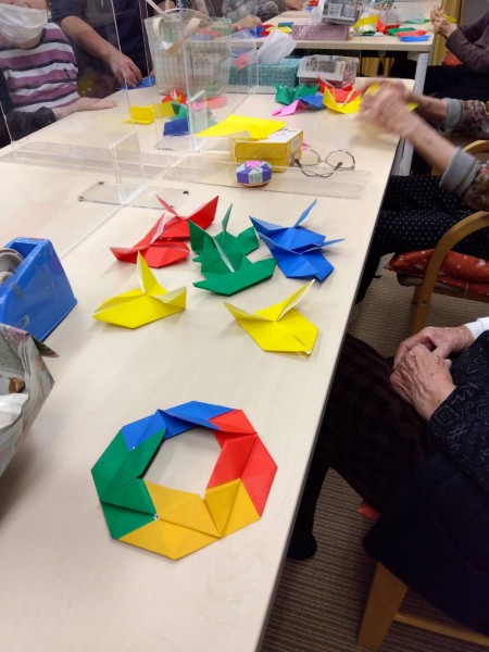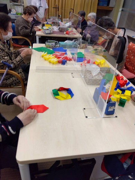 カラフルな折紙でクリスマスリースを作成中。来月の壁画にたくさん飾りますねーー☆。