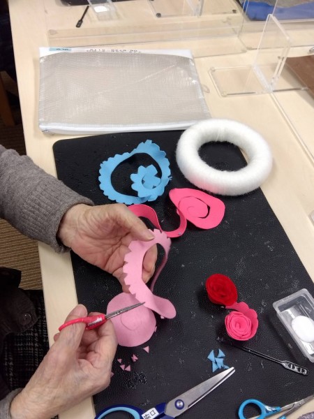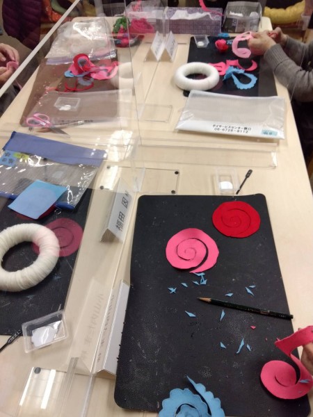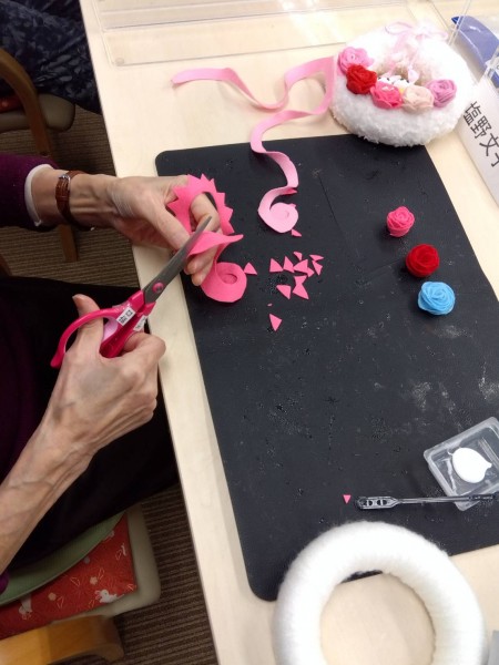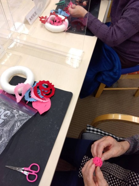 完成すると可愛い毛糸のリースの中に、ウサギのお雛様を飾ります。