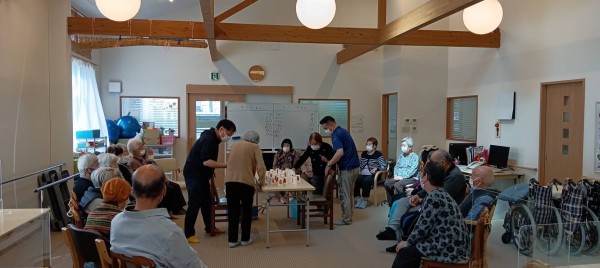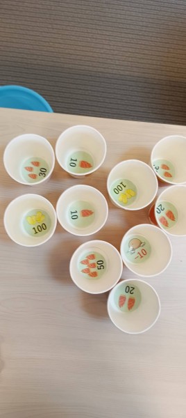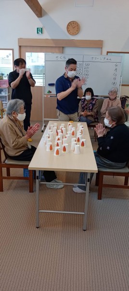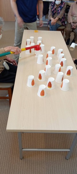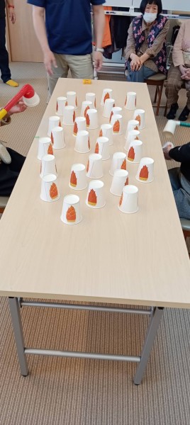クワ(棒先に紙カップ)で、テーブルに広げられたタケノコ(カップ)を取ります。 20秒間でたくさん取って点数を競いまーーーす!