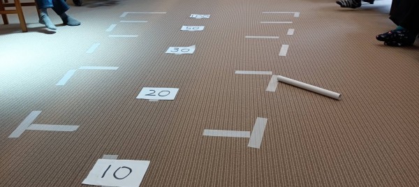 今週はチームに分かれてラップの芯を足で転がし点数を競うゲーム!