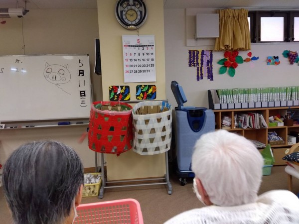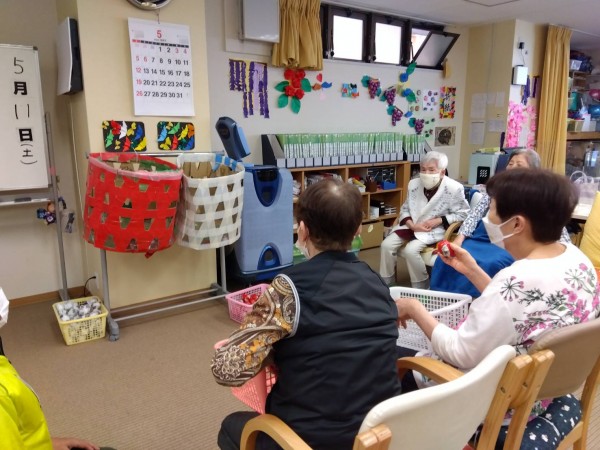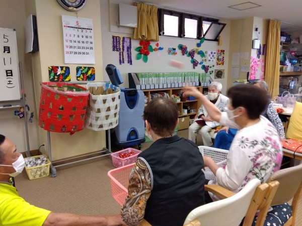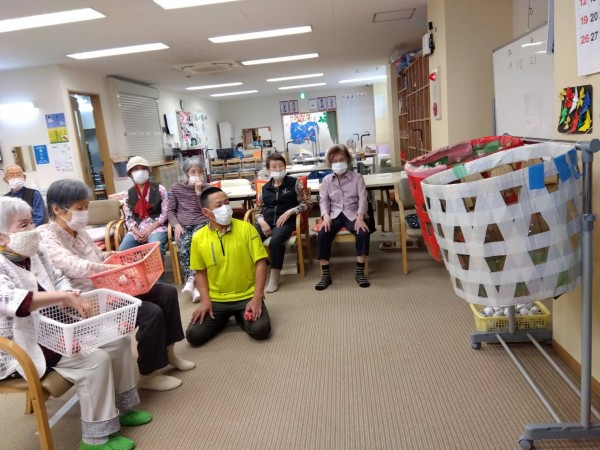 1号店、今週のレクは紅白玉入れ~~。