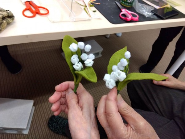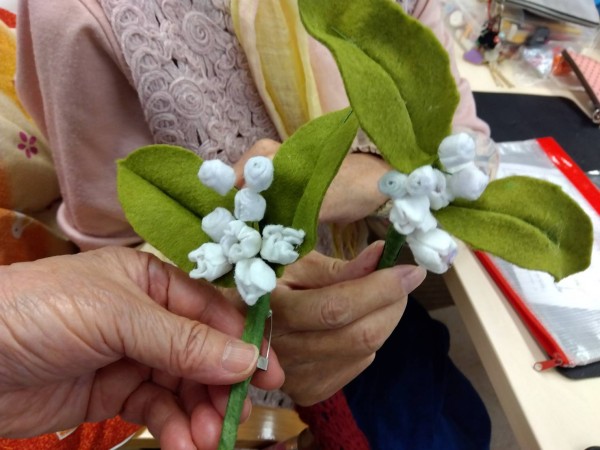 今週の手芸クラブは「すずらんのブローチ」