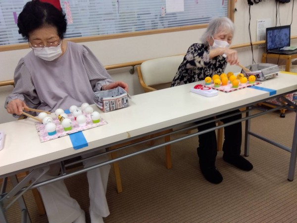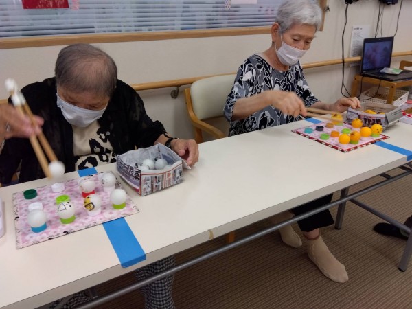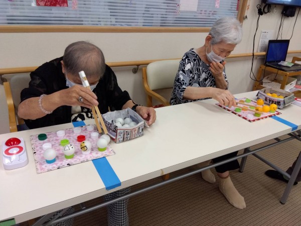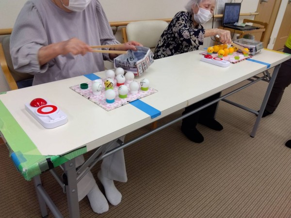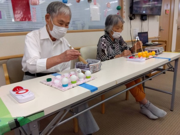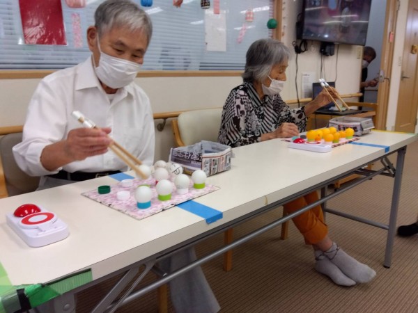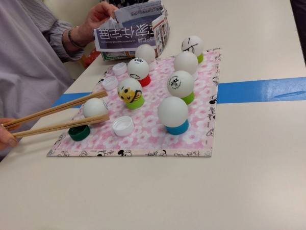 どっちが早くピン球をつまんで移動できるか?ゲーム。