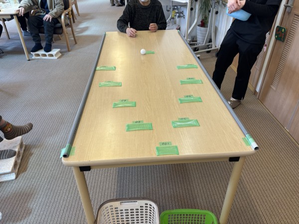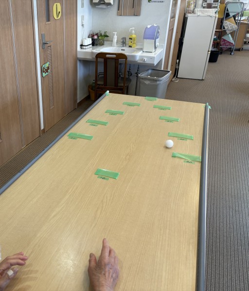 ピンポン玉を転がして高得点のテープの上で止めます。