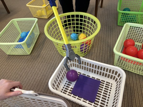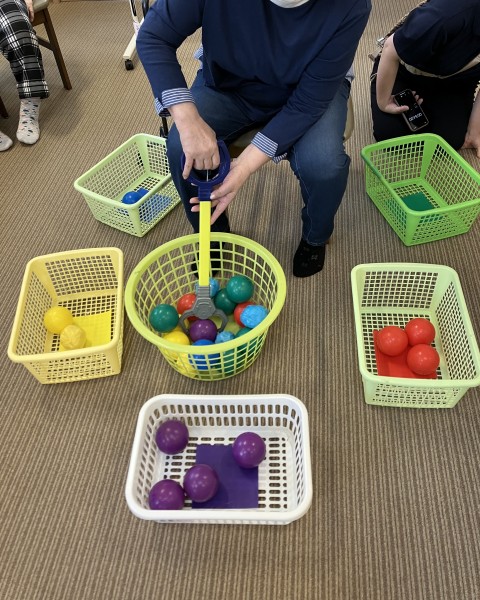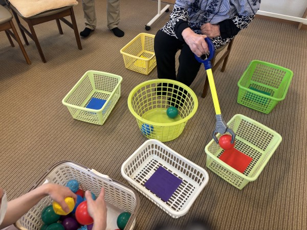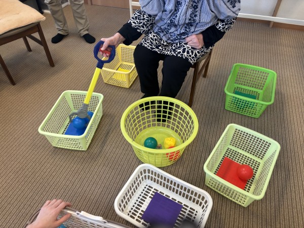 青色のボールがカゴに入りました。腰や腕の運動につながっていますね。