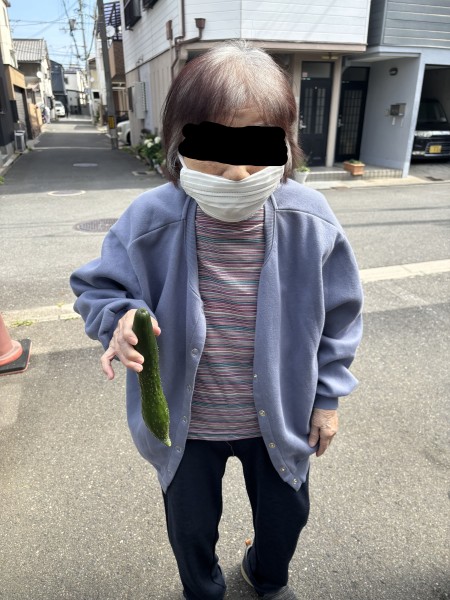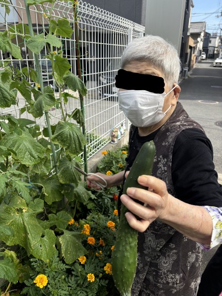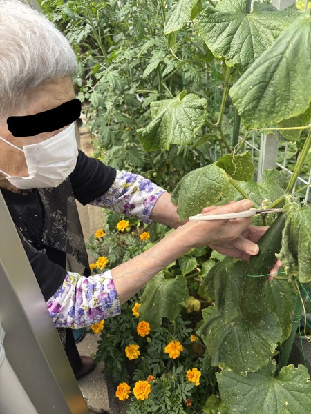 今朝、キュウリの収穫をして、皆さんでお昼に食べて下さいました。