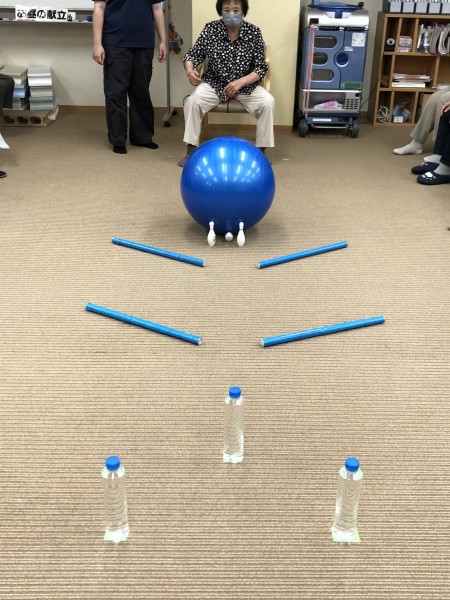 今回のゲームは、大きなボールを転がして〜🎳ピンとペットボトルを倒します!