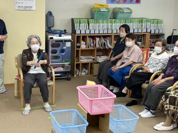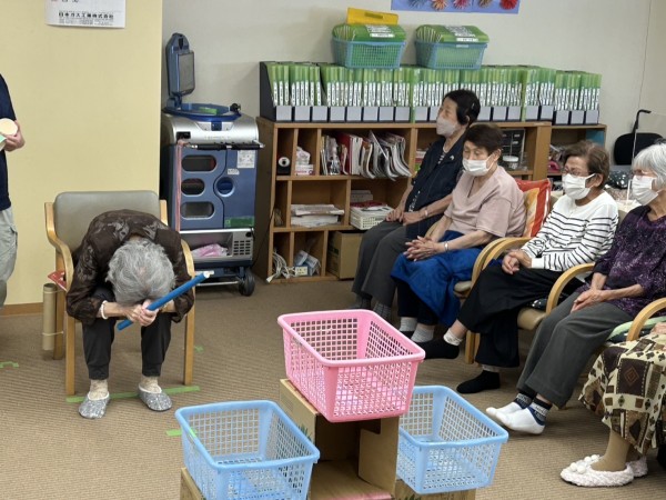 紙コップを飛ばして高得点のカゴに入れて下さい!