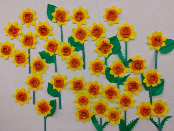 折紙クラブの作品が今月の壁画になりました。満開のひまわりです。